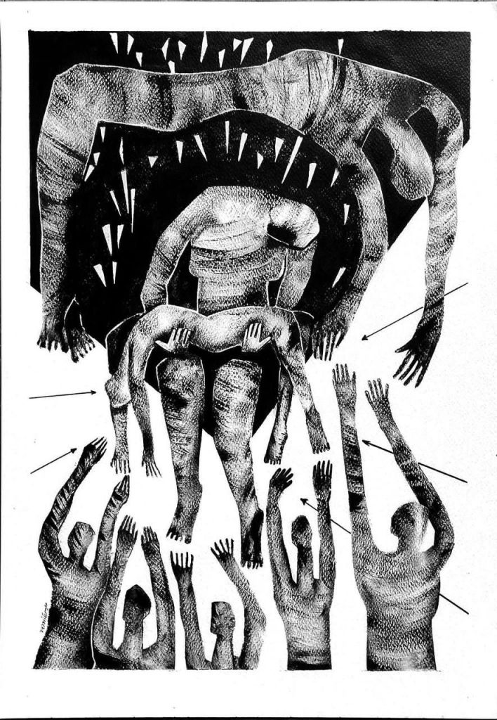 ارتش اسرائیل، پاکسازی خود را به مراحل پایانی رسانده و نگارهی بارود، نشان میدهد که مردگان در انتظار مردهای دیگر هستند که در دستان مردهای دیگر و زیر چتر مردهای دیگر، در حال تحویل به خدای مرگ در دنیای مردگان است.